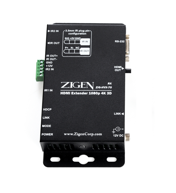 Urządzenie ZID-HVX-70R to odbiornik kompatybilny z matrycami Zigen z technologią HDBaseT. Korzystając z wyjść w HX-44, HX-88/HDBT i HX-1616/HDBT, rozszerza sygnały HDMI do 70 metrów za pomocą kabla CAT5a/6/7. Jednostka odbiorcza obsługuje transmisję sygnałów IR z systemu sterowania, umożliwiając zdalne sterowanie urządzeniami źródłowymi lub wyświetlaczami.